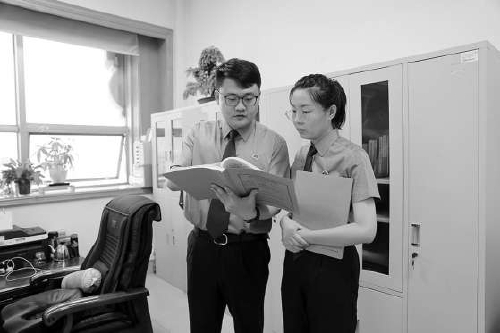 袁洪志(左)和同事讨论案情