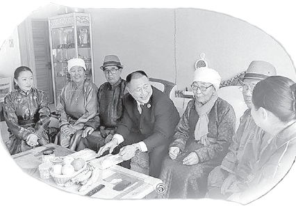 图⑤:内蒙古自治区苏尼特左旗检察院副检察长前德门到牧民家里普法。