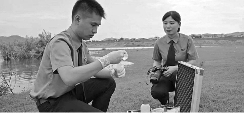 清远市检察院检察干警运用快检设备进行现场水质检测。