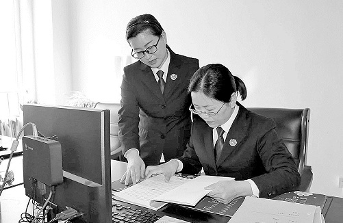 办案检察官郗秀贞(右)与助理核对涉案资金数额。