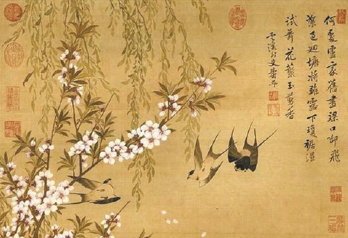 在历代咏鸳鸯诗中名句很多,如白居易的“鸳鸯荡漾双双翅,杨柳交加万万条”,刘禹锡的“无端陌上狂风急,惊起鸳鸯出浪花”,杜牧的“尽日无人看微雨,鸳鸯相对浴红衣”,汪广洋的“芦叶青青水满塘,文鸳晴卧落花香”……