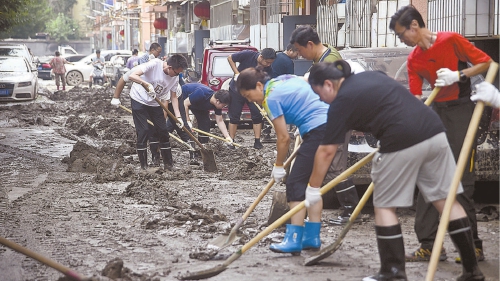 8月3日,北京市门头沟区检察院组织干警来到受洪水影响的社区参与道路清淤工作。 本报见习记者钟心宇摄
