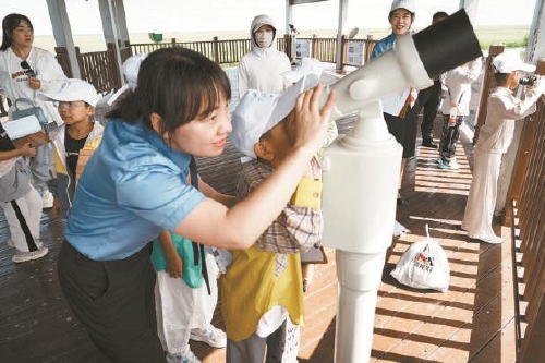 8月7日,黑龙江省宝清县检察院未检部门组织20余名小学生来到七星河国家级自然保护区,开展“携手保护生态,共创美好未来”主题教育宣传活动,提升同学们保护生态环境意识,激发他们承担保护生态环境重任的热情。图为活动现场,检察官指导孩子们观察湿地内的水鸟。 本报记者韩兵 通讯员何清玲摄