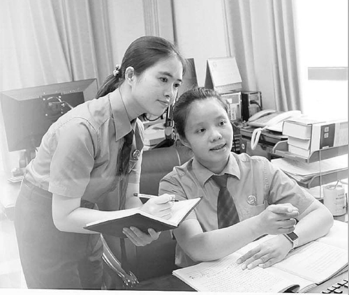 余静(右)向徒弟李烨薇讲解如何多元救助帮扶涉案未成年人。