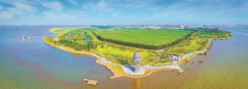 (题图说明:从空中俯瞰张家港湾,鱼形雕塑成为张家港湾的地标,也是张家港长江生态保护的重要标志。 任广真摄)