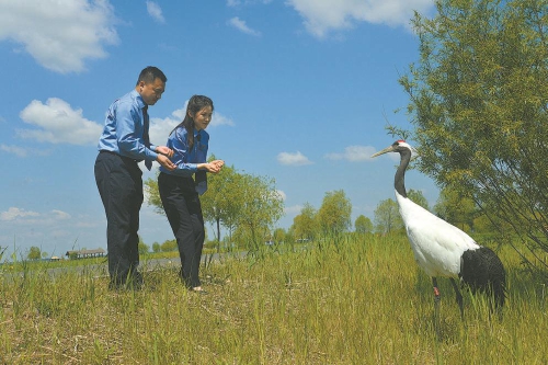 图为检察官在扎龙湿地探访刚刚回乡的丹顶鹤,查看其生活环境和返乡生存状态。