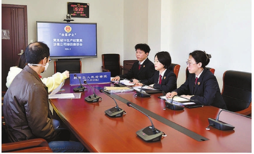 办案组与被害企业代表沟通证据情况。