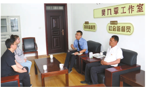 在“樊九平工作室”,樊九平(右一)与检察官向村干部了解一起案件中双方当事人产生矛盾的经过。