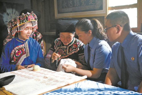 7月8日,四川省叙永县检察院检察官前往枧槽苗族乡调研非遗保护工作,实地了解苗族蜡染、苗绣非遗技艺的保护传承情况,以及非遗技艺发展过程中面临的法律问题,同时向当地手艺人介绍公益诉讼在文物和文化遗产保护与传承领域的职能作用。