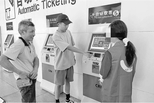 大学生社工赵鑫浩(中)带领菲儿(右一)到高铁站做义工。