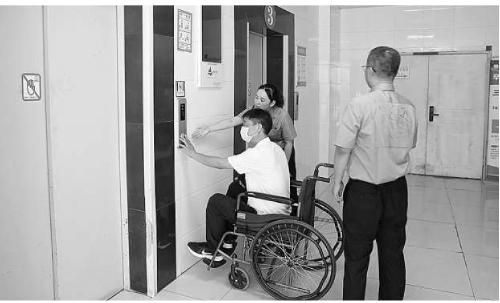 图为玉屏县检察院检察官邀请“益心为公”志愿者、残障人士郑先生现场体验医院住院部整改后的无障碍电梯。