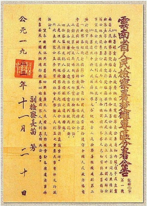 《公告》宣布云南省人民检察署楚雄专区分署成立,由专署公安处副处长苗芳兼任副检察长,办公地点在楚雄县西门外专署公安处内。