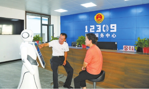 樊九平(左)在甘泉县检察院12309检察服务中心面对面为群众答疑解惑。
