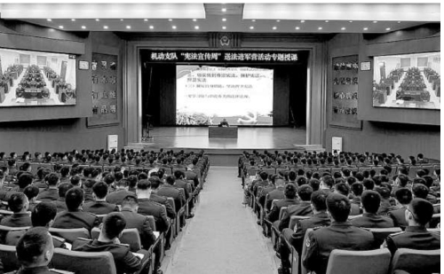近日,哈尔滨军事检察院与黑龙江省哈尔滨市南岗区检察院深入军营开展宪法宣传教育,军事检察官围绕“尊崇捍卫宪法 献身职责使命 做党和人民的忠诚卫士”主题,深入阐释习近平法治思想中蕴含的宪法精神,教育引导广大官兵把法治精神内化为政治信念和道德修养,外化为行为准则和自觉行动。