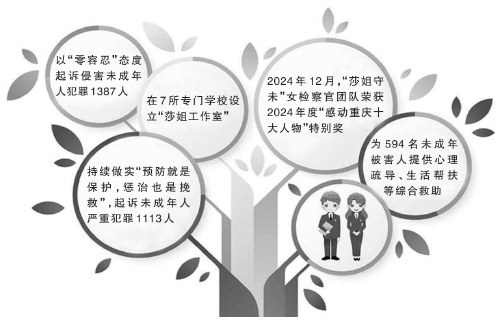 2024年以来,重庆市检察机关深化“莎姐守未”“检护成长”专项行动,以“零容忍”态度起诉侵害未成年人犯罪1387人。持续做实“预防就是保护,惩治也是挽救”,起诉未成年人严重犯罪1113人。协同推动罪错未成年人分级干预矫治,与重庆市教育委员会建立专门学校工作衔接机制,在7所专门学校设立“莎姐工作室”。联合有关部门及群团组织,为594名未成年被害人提供心理疏导、生活帮扶等综合救助。“莎姐”青少年维权岗自2004年组建以来,历经20年,始终坚持德法相伴,守护未成年人健康成长。2024年12月,“莎姐守未”女检察官团队荣获2024年度“感动重庆十大人物”特别奖。