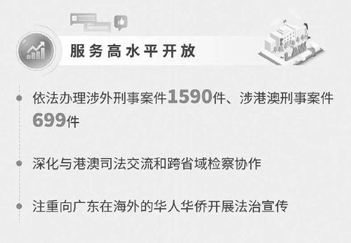 本报讯(记者高燕艳 通讯员李霞)“公开平等保护中外当事人合法权益,依法办理涉外刑事案件1590件,涉港澳刑事案件699件。深化与港澳司法交流和跨省域检察协作,更好服务保障大湾区建设。”日前,广东省检察院党组书记、检察长冯键在广东省十四届人大三次会议上作检察工作报告,报告中关于服务高水平开放的检察工作履职成效获代表们关注与点赞。