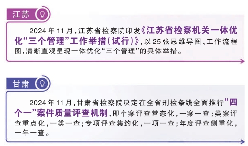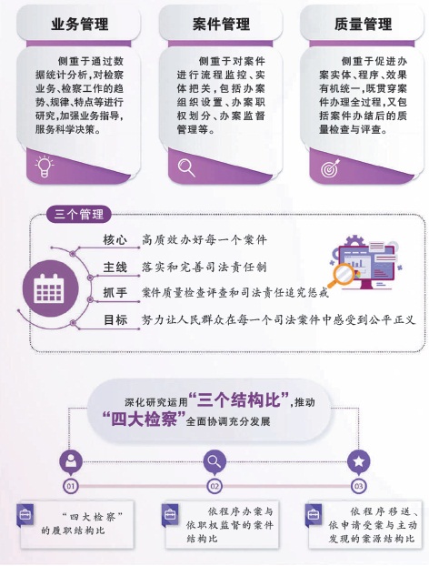 新时代新征程,高质效推进检察工作,抓管理的责任更重、要求更高。2024年,全国检察机关牢固树立正确政绩观,聚焦法律监督主责主业,进一步加强和改进检察管理,贯通推进业务管理、案件管理、质量管理“三个管理”,着力构建检察“大管理”格局,把科学管理效能转化为高质效办案实绩,为检察工作高质量发展提供持久动能。