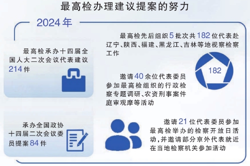 据了解,2024年,最高检承办十四届全国人大二次会议代表建议214件,承办全国政协十四届二次会议委员提案84件。在与代表委员的良性互动中,一个个“金点子”转化成了一项项人民群众可感受、能体验、得实惠的检察举措,全过程人民民主的检察画卷正在徐徐绘就。