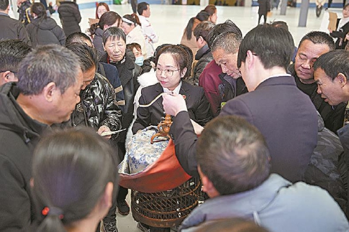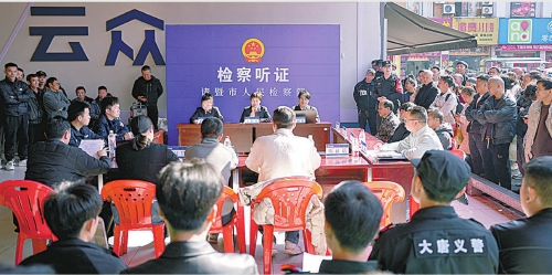 居民上交画眉鸟后,检察官现场释法。 公开听证会现场。 3月17日,浙江省诸暨市检察院把廖某等3人涉嫌危害珍贵、濒危野生动物案公开听证会“搬”到大唐街道劳动力市场,邀请人民监督员、人大代表、政协委员、公安侦查人员、当事人等参加听证,数百名群众现场旁听。听证员经过讨论,一致认可检察机关对廖某等3人拟作不起诉处理的意见。听证会后,检察官开展现场普法,向群众发放保护野生动植物倡议书。廖某等3人也化身“护鸟使者”,与检察官一起以案释法。一名居民听了普法宣讲,当场将自己非法猎捕的一只画眉鸟上交。检察官联合行政机关工作人员对其进行了批评教育,让画眉鸟重获自由。 (本报通讯员何若愚)