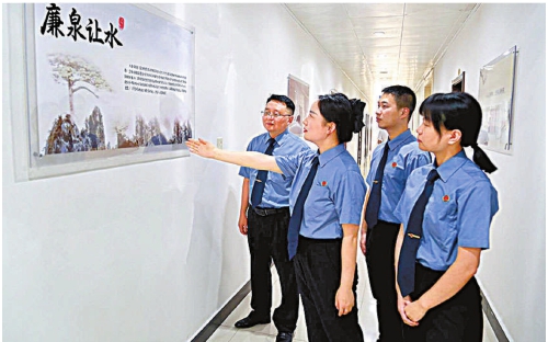 6月27日,陕西省汉中市南郑区检察院青年干警在清廉长廊驻足学习“廉泉让水”的典故。