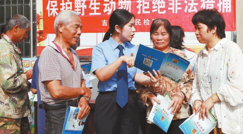 6月4日,江西省吉水县检察院组织检察干警来到该县文峰镇炉村,开展以“保护野生动物 拒绝非法猎捕”为主题的普法宣传活动。活动中,检察干警结合所办典型案例向村民宣传保护野生动物的法律法规,详细讲解了非法狩猎活动对生态环境的危害。