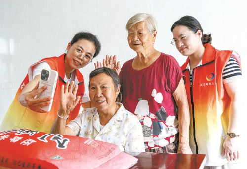 10月5日,江苏省南通市通州区金新街道界北村志愿者帮助老人与远在海外的子女进行视频通话,“云端”相聚,共迎中秋。 新华社发 翟慧勇摄