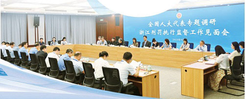 今年10月底,十四届全国人大常委会第十八次会议将审议最高人民检察院关于人民检察院刑罚执行监督工作情况的报告。为此,9月23日至25日,最高检以“加强刑罚执行监督,维护社会公平正义”为主题,邀请来自北京、吉林、浙江、湖南、甘肃等五省(市)的16名全国人大代表组成调研组,对浙江省检察机关刑罚执行监督工作进行为期3天的专题调研。