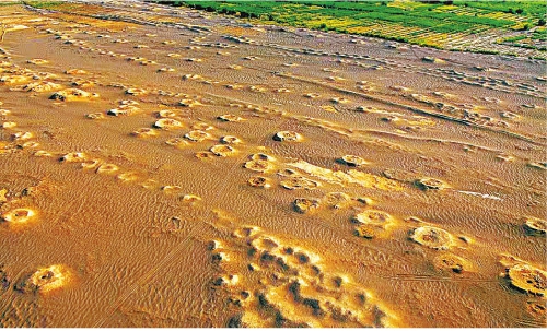 从空中俯瞰坎儿井,一个个井口连接成线。 杨新才摄