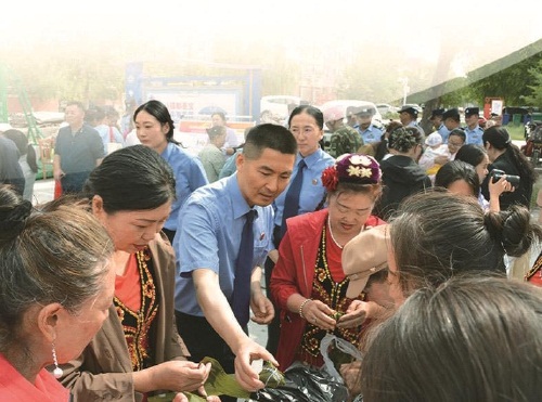 今年5月,江苏省金湖县检察院援疆干部与新疆生产建设兵团奎屯垦区群众一起“包法治粽”,宣传反诈常识。