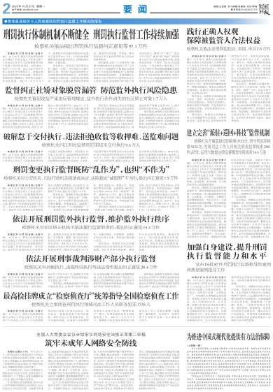 报告指出,检察机关深化数字检察赋能作用。持续加强数字化、智能化建设,以现代科技赋能刑罚执行监督。加强与公安机关、司法行政机关等协作配合,推动派驻检察室与监狱、看守所监控和执法信息联网全覆盖。最高人民检察院与最高人民法院、司法部共同推动减刑、假释信息化办案平台建设,已有23个省份实现相关案件线上办理和流转。各地检察机关总结刑罚执行监督类案规律,研发、运用大数据法律监督模型,发现线索14.4万条,监督成案4.2万件。