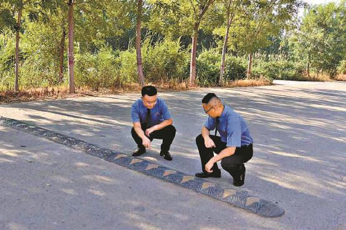 今年7月,庆云县检察院公益诉讼检察官实地勘查减速带损坏情况。
