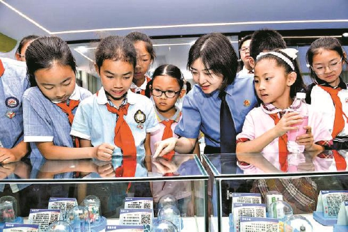 今年5月29日,宜昌市伍家岗区检察院举办“携手关爱 共护未来”检察开放日活动。图为检察官通过实物展示,帮助孩子们直观认识新型毒品的形态,提升识毒、防毒意识。