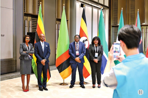 图⑪:会间,赞比亚共和国代表在国旗旁合影留念。