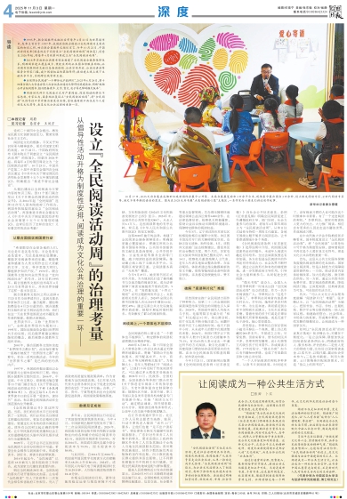 在中央民族大学法学院教授张步峰看来,国务院批复设立“全民阅读活动周”,将“全民阅读”从倡导性口号升格为制度性安排,意味着阅读不再仅是个人爱好及文化符号,更是文化公共治理的重要一环。