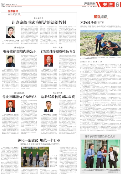 10月24日,部分全国人大代表在调研中了解这一情况后表示赞赏,并提出了“推进跨部门、跨区域资源互通、问题共治”等意见建议。全国人大代表、甘肃省临夏回族自治州私营企业协会会长、东乡族自治县伊菲种植养殖农民专业合作社理事长张忠山表示:“我们甘肃生态系统比较脆弱。我通过实地调研,切实感受到了酒泉检察机关依法监督,致力于生态环境保护的法治担当。”