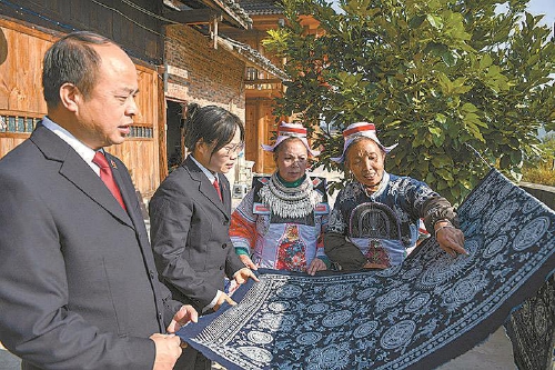 图⑧:雷山县检察院检察官在“雷山县刺绣之乡”猫猫河村向绣娘了解传统苗族刺绣技艺。