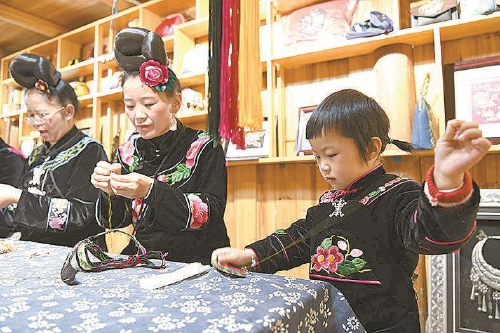 图①:在雷山县非遗苗族蝴蝶刺绣工坊内,苗族小女孩在母亲的带领下学习传统苗族刺绣针法。