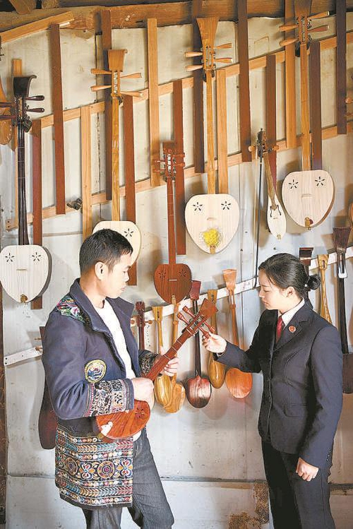图⑥:侗族乐器制作传承人陆东辉向检察干警介绍月堂琴制作工艺。