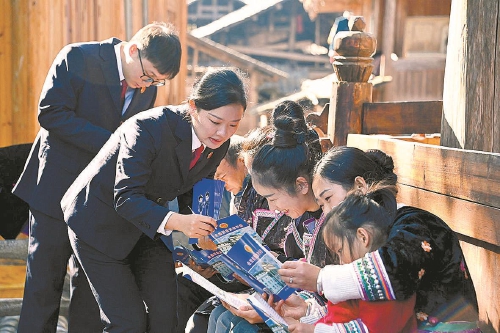 图⑦:黎平县检察院检察干警走访黄岗侗寨,为侗族大歌非遗传承人普及法律知识。