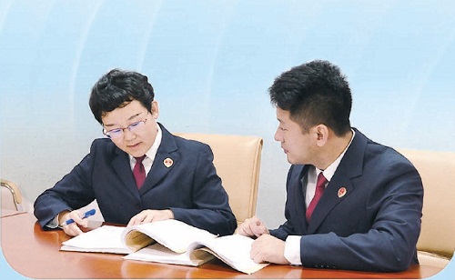 今年1月,办案检察官孙娟(左)与检察官助理对案件开展审查。