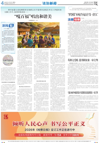 在贵州省雷山县苗寨深处,每当晨光洒满青瓦木楼,或是暮色笼罩梯田,总能听到悠扬婉转的“嘎百福”。作为国家级非物质文化遗产项目,“嘎百福”不仅是苗族群众日常生活的一部分,更凭借其独特的叙事方式和深厚的伦理教化内核,成为连接法理与情理、沟通检察与群众的文化桥梁。近年来,雷山县检察院创新司法实践,让乡音传递法理,借助传统民族智慧化解矛盾纠纷,推进少数民族地区基层治理,彰显了检察温度与民族文化自信。