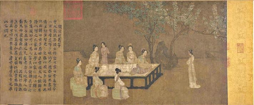 《女孝经图》卷,宋,绢本,设色,纵43.8厘米,横823.7厘米。作者以图解的形式分9段展现唐代侯莫陈邈之妻邓氏所撰《女孝经》前九章的内容,依次为:开宗明义章、后妃章、三才章、贤明章、事舅姑章、邦君章、夫人章、孝治章、庶人章。每段图后均有墨题《女孝经》原文与之对应。