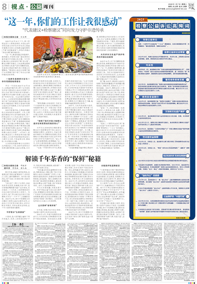 据了解,2025年,最高检公益诉讼检察厅坚持高质量建议和高质量办理相结合,同题共答、同向发力,打下了坚实基础。2026年,围绕全国人大常委会制定检察公益诉讼法和修订非物质文化遗产法等立法工作计划,持续落实全国人大常委会在非物质文化遗产法实施情况执法检查报告中明确提出的“建立健全非遗公益诉讼制度”审议意见,充分发挥代表作用,支持和保障代表依法履职,滚动办理专项跟踪检查建议将迎来新契机。
