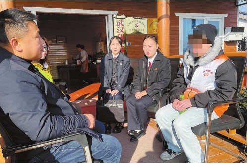 1月7日,“心港湾”观护基地负责人、湖北省人大代表程林利(左一)与帮教对象小泽(化名)谈心谈话。