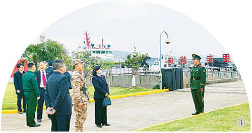 图④:浙江省宁波市北仑区检察院检察官与海警工作人员登陆巡逻船前,海警工作人员向检察官介绍执法情况。