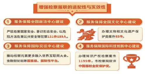 报告显示,北京市检察机关服务保障全国政治中心建设,全面准确贯彻宽严相济刑事政策,严惩危害国家安全、意识形态安全、以危险方法危害公共安全等犯罪131件189人,五年累计报请最高人民检察院核准追诉超过追诉时效的严重暴力犯罪分子25人,宣示正义虽久必至;起诉非法集资、洗钱等犯罪935件1697人;检察力量入驻综治中心全覆盖,法治化、实质性化解重点涉法涉诉矛盾纠纷392件。服务保障全国文化中心建设,发挥习近平法治思想北京市法律监督实践研究基地作用,承办第二届“习近平法治思想的北京实践”研讨会。服务保障国际交往中心建设,办理该市首例以虚拟货币为媒介非法经营外汇等涉外案件592件。服务保障国际科技创新中心建设,办理知识产权检察案件1195件;办理涉优化提升传统产业、培育壮大新兴产业和未来产业案件104件;突出全球数字经济标杆城市建设需求,惩治侵犯数据权益犯罪108件。