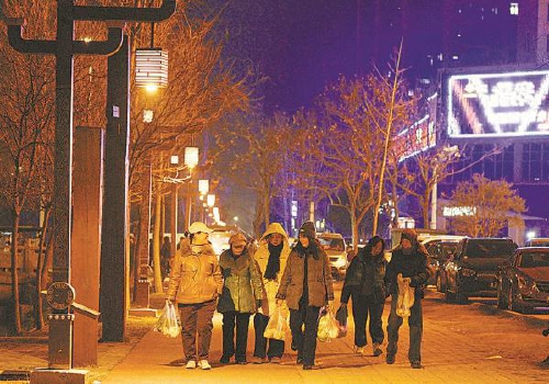 二月二日晚上,湖南省安乡县深柳镇居民购物后,在宽敞明亮的安乡大道步行回家。