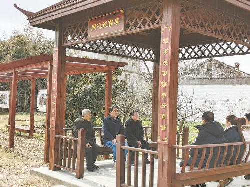 2024年2月27日,张强(左二)在江苏省泰兴市宣堡镇开展村规民约调研,倾听村民们的心声。