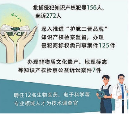 本报讯(全媒体记者吴杨泽 王鹏翔)“刑事、民事、行政、公益诉讼检察协同发力,批捕侵犯知识产权犯罪156人,起诉272人。”记者近日从山西省第十四届人民代表大会第五次会议上了解到,该省检察院工作报告中关于护航新质生产力发展的内容,受到代表们的广泛关注和高度肯定。