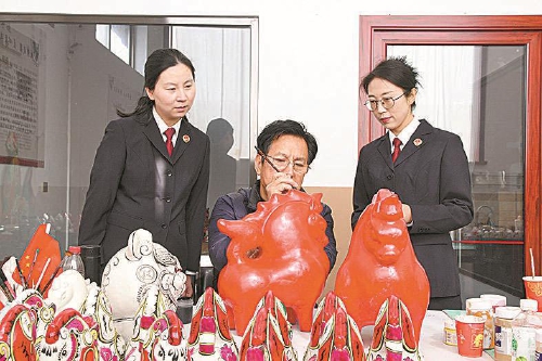 近日,陕西省宝鸡市凤翔区检察院检察官前往六营村胡新明泥塑工作室,详细了解泥塑产业发展中面临的知识产权保护等法律需求。图为检察官现场观摩胡新明(中)的精湛技艺。